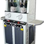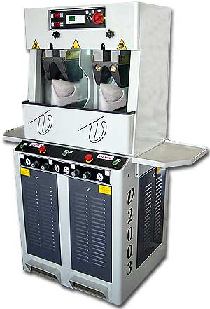 Esta máquina moldea las palas (empeines) por presión y calor con moldes de silicona y las almohadillas de aluminio, que pueden ser cambiadas con facilidad en función de los diferentes modelos del corte.