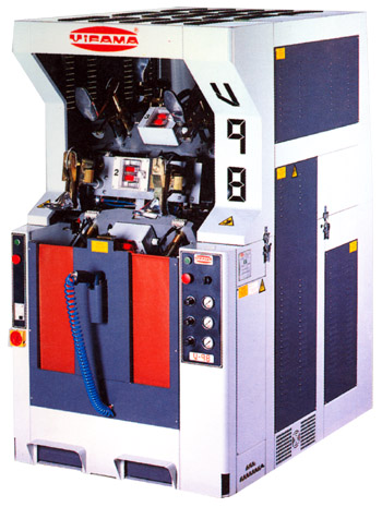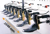 De serie, la maquina incorpora control digital de temperatura independiente para el talón y la punta, así como total independencia del control de temperatura de cada par, permitiendo un ajuste exacto a las necesidades del tipo de piel. De forma automática, puede controlar la calidad de la producción, sin preocuparse de lo grande y variada que esta sea. V-98 le permite un fácil y rápido cambio de los moldes, de la punta y del talón. Por tanto, también la posibilidad de combinar diferentes modelos de zapatos en cada etapa.